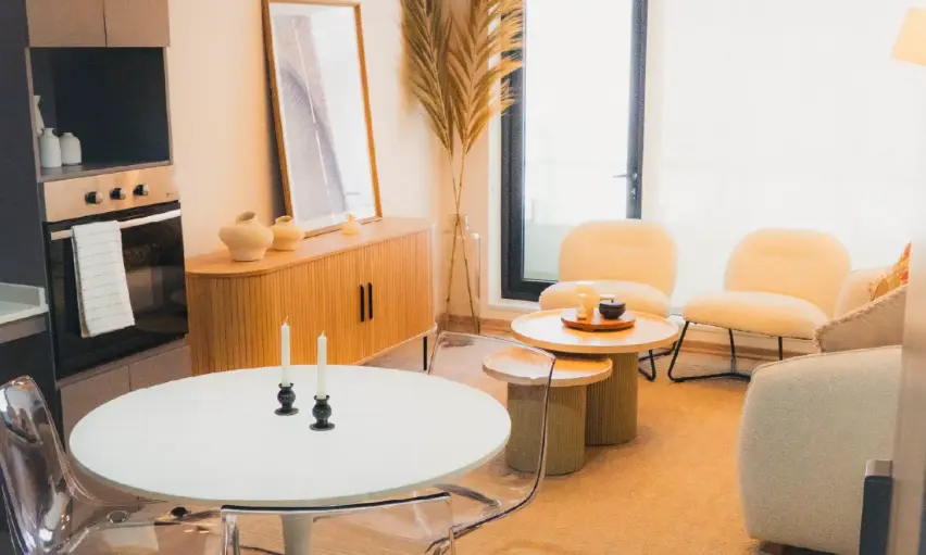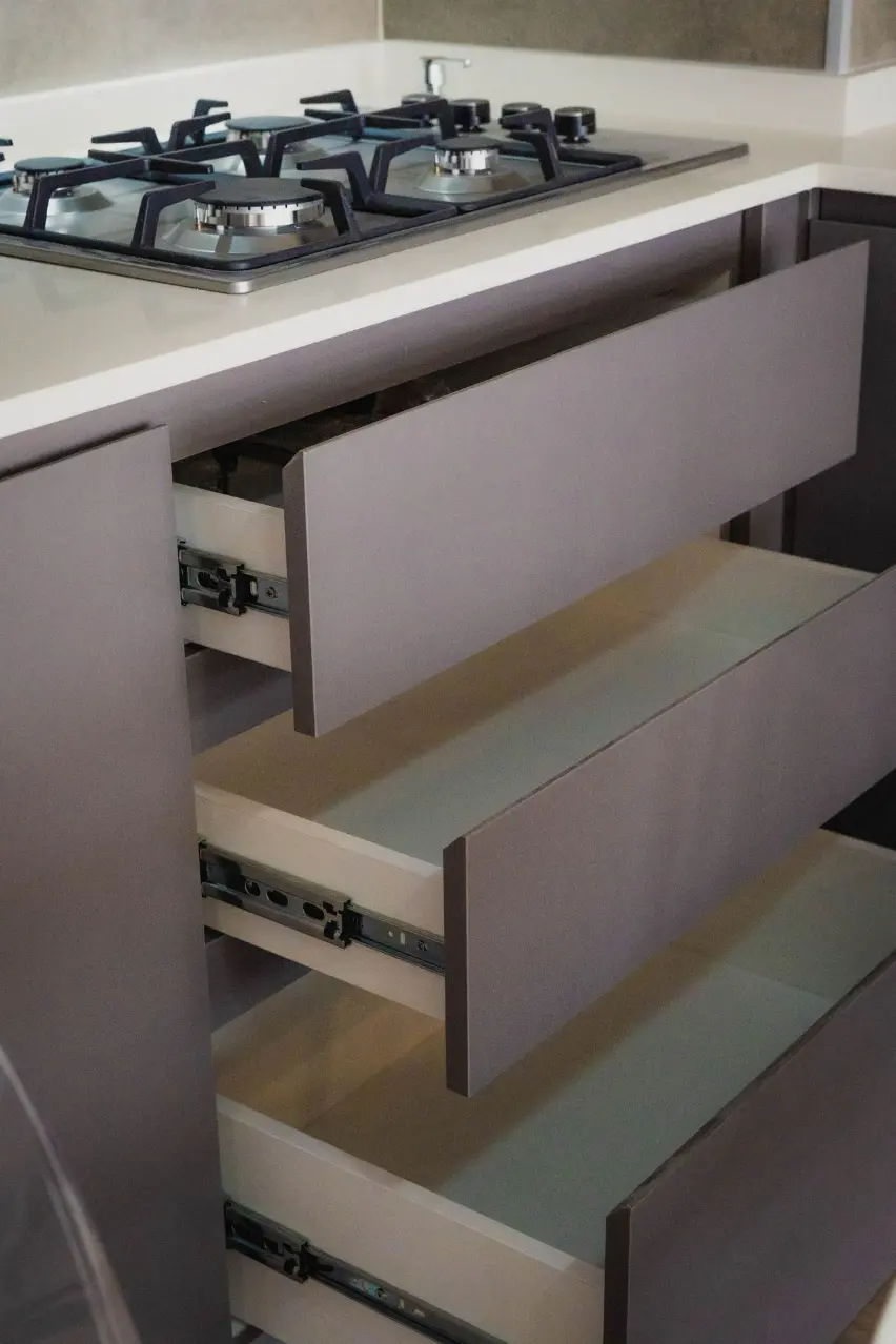 - Cocinas integradas, equipadas con horno eléctrico, encimera , campana, muebles de melamina y cubierta de piedra reconstituida